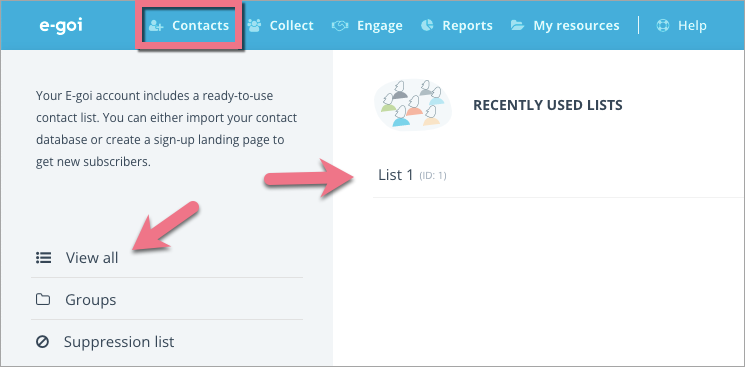 To see your leads in the E-goi platform, click on the Contacts tab and then select your list or View all.