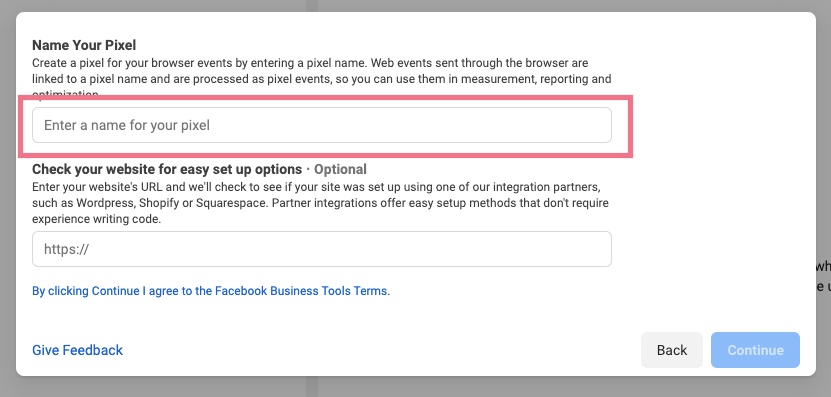 5. Add your Pixel Name. You can also enter your website URL to check for easy setup options. Click Continue.