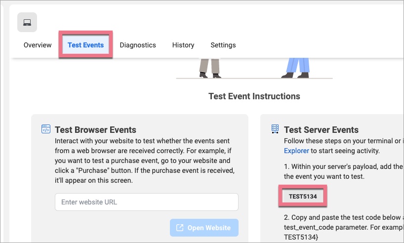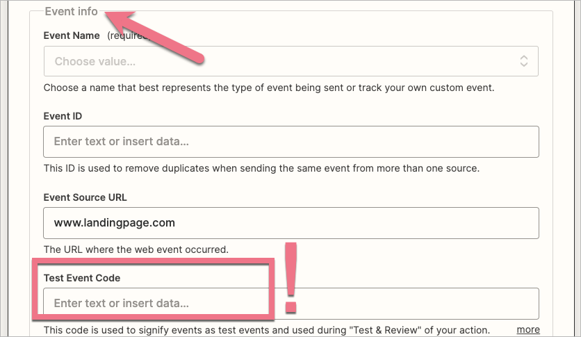 12. In the next field, Test Event Code, paste the event test key from Facebook. Go back to Events Manager, navigate to the Data Sources tab, find your pixel and click on Test Events. Copy the key and paste it in Zapier.