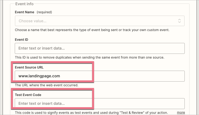 11. Next, specify the details of Event Info, Customer Information, and Custom Data that will be sent together with the event action. The fields must match the fields of the form on your landing page.
