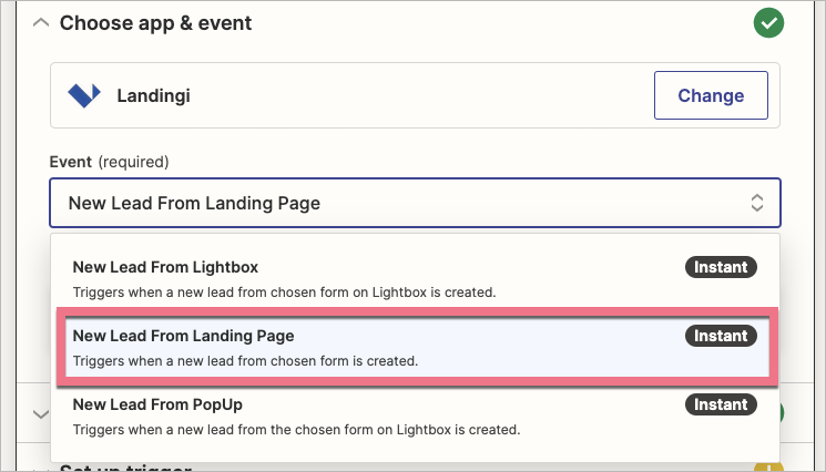 3. In the first step, define the trigger. Search for Landingi and click Connect.