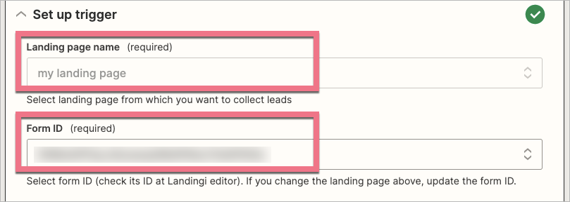 6. Choose a landing page and form ID. The list will display only published landing pages and forms that are added to regular sections.
