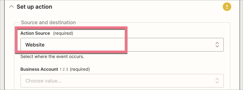 10. In the Set up action section, choose Website as Action Source, select a business account and the pixel.