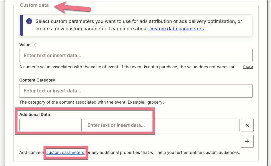 13. If you want to track a purchase event, fill out the fields Custom Data > Additional Data. Click on custom parameters to see the most common values.