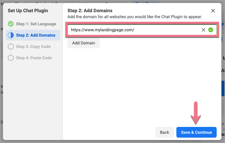 4b. Add the domain on which your landing page runs. You can add more domains by clicking Add Domain. Then Save & Continue.