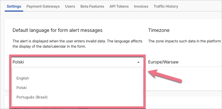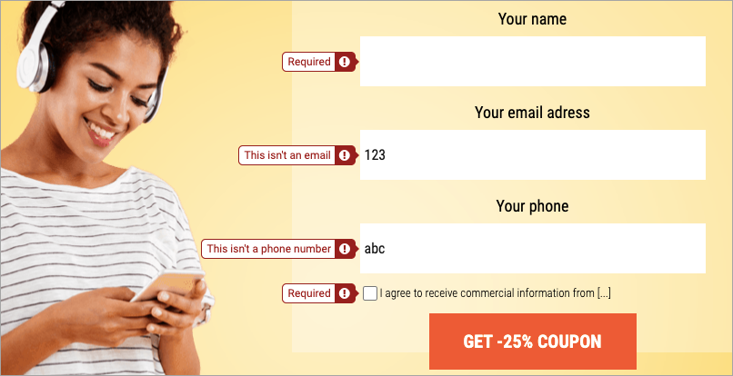 Alert messages are displayed when users enter invalid data in your form on a landing page, pop-up, or lightbox. By default, form validation messages are displayed in the language of your account in Landingi. You can choose from four default languages for all landing pages, set the language for each form, or translate and change the alert using JavaScript code.