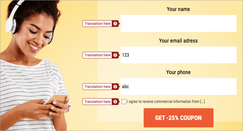 </script>Replace Translation here with your own alert message that will appear when the user incorrectly fills out the form.