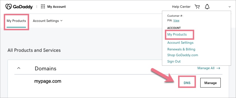 3. Scroll down. In the All Products and Services section, find your domain and click on DNS.