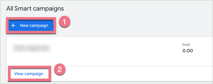 1. Log in to your Google Ads account, create a new campaign (1) or select an existing campaign and click on View campaign (2).