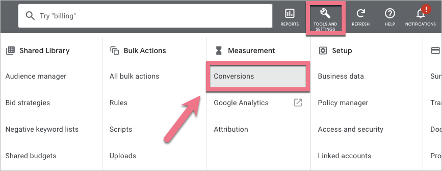 2. In the upper right corner, click the tools icon and click Conversions in the Measurement section. If you don’t see this section, click on Switch to Expert Mode.