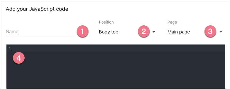 4. Type in a name (1) and select the Body top (2) position on the Main page (3). Paste your code in the Content (4) field. Click on Add script.