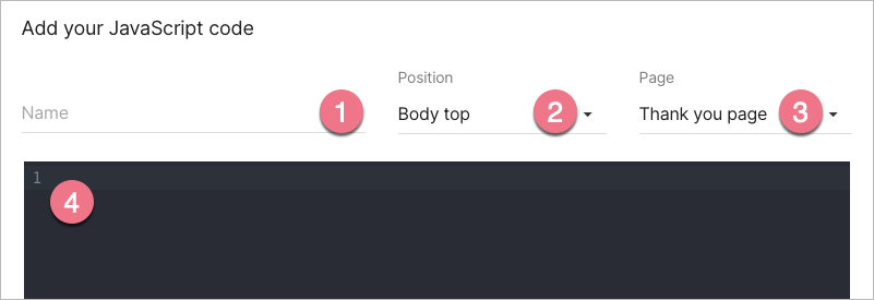 4. Type in a name (1) and select the Body top (2) position on the Thank you page (3). Paste your code in the Content (4) field. Click on Add script.