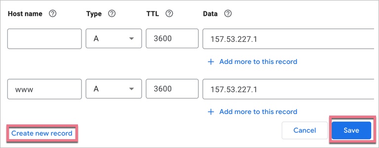 1. Add two A records: one for your root domain and one for the www subdomain. If you already have these records, edit their values. The field “Host name” of the root domain is empty .