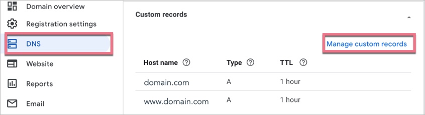 3. Go to the DNS tab on the left, and select Manage custom records.