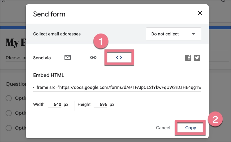 3. Click Embed (1) and then Copy (2). Here, you can also adjust the width and height of the form/survey.