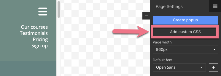 9. Enter the Page Settings on the right panel and click on the Add custom CSS button.