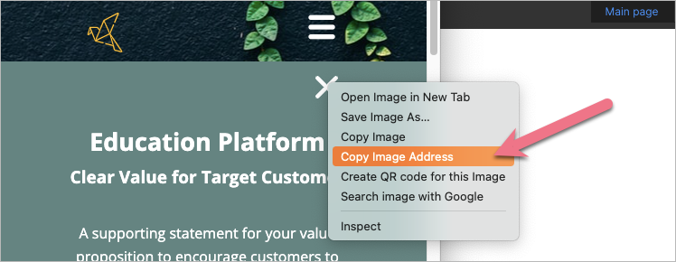 12. You need to get the icons’ URL addresses: on a published landing page, right-click on an icon and select Copy Image Address. Repeat for both icons.