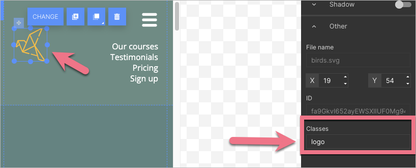 1. Click on the image (your logo) and in the right-side toolbar, find the Other tab. Type logo in the Classes field.