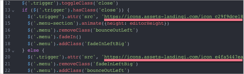 15. In lines no. 14 and 20, change https://closingiconlink.svg and https://openingiconlink.svg to the icons addresses copied from your landing page.