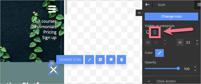17. Go back to the editor. In the mobile view, click the closing icon and turn off its visibility.