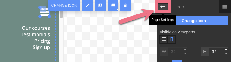 When editing, you can go back to Page Settings by clicking on the arrow: