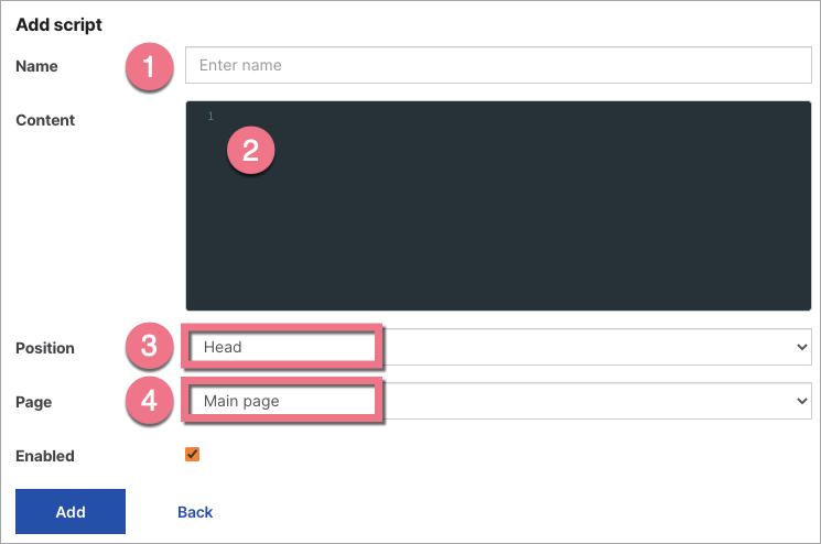 3. Name (1) your script and paste the code in the Content (2) field. Choose the Head (3) position on the Main page (4). Then click Add.