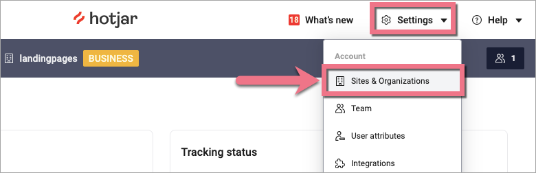 1. Log in to your Hotjar account, go to Settings and enter the Sites & Organizations tab.