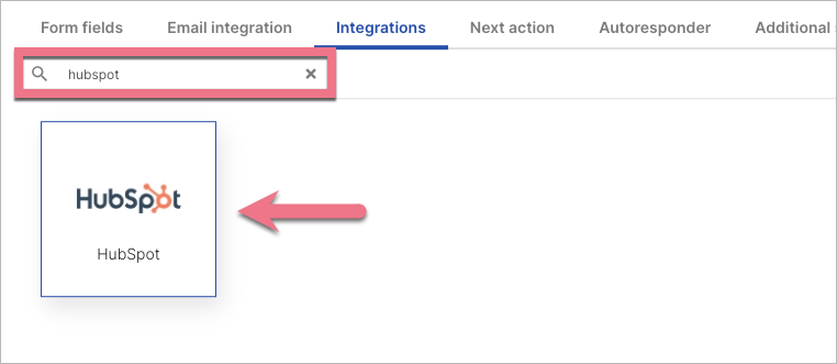 3. In the Integrations tab, select HubSpot. You can use the search bar to look for the integration. Type the name and press enter.