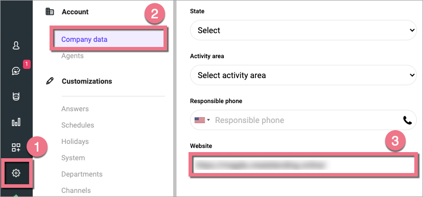 2. Before you get the code to install your Huggy Chat, make sure that you have entered your landing page URL in settings. To do so, go to Settings (1), select the Company data (2) tab, and change your website URL (3).