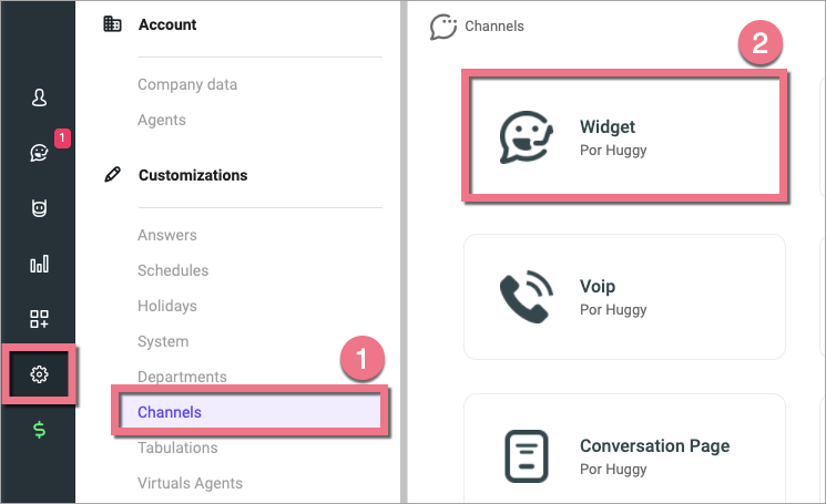 3. In Settings, navigate to the Channels (1) tab and click Widget (2).