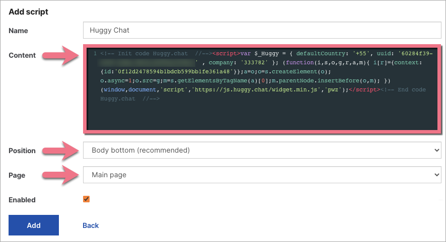 3. Name your script, paste the code in the Content field and choose the Body bottom position on the Main page. Save by clicking Add.