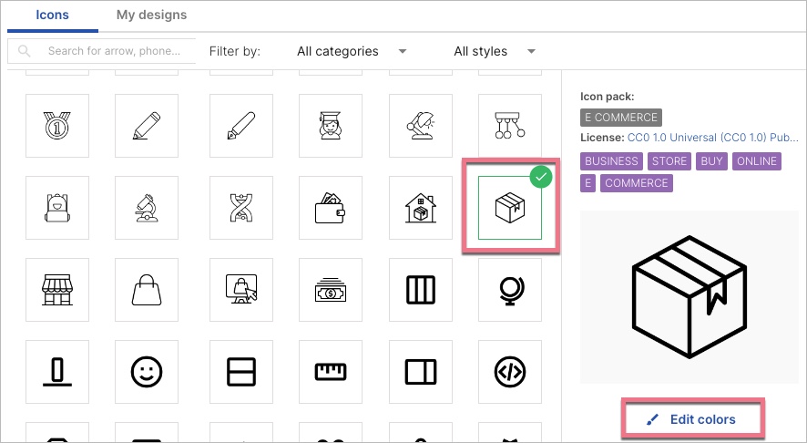 You’ll see a library of icons. You can filter them by categories and styles.