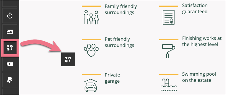 Icons help to navigate through a page, highlight text fragments, and visually complete the content or sometimes replace it. In Landingi, you can choose from hundreds of free icons and adjust the colors to align them with the theme of your campaign.