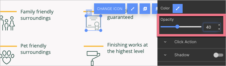 You can also change an icon’s opacity. Select the icon and adjust the percentage of opacity in the right-side toolbar.
