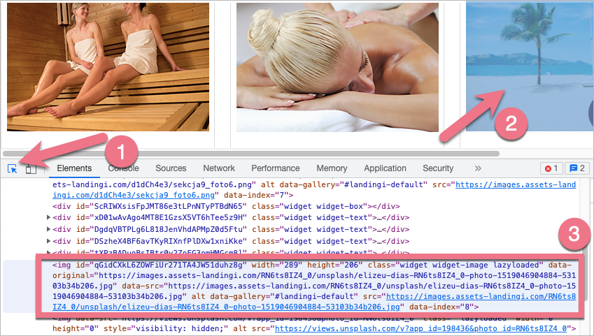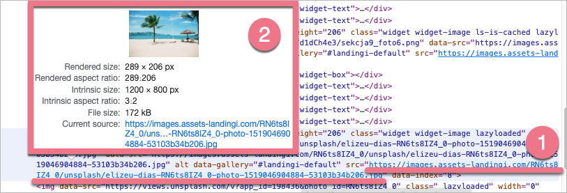 3. Hover over the src link (1). In a pop-up window (2), you will find the original image’s size (intrinsic size), link (current source), and other information.