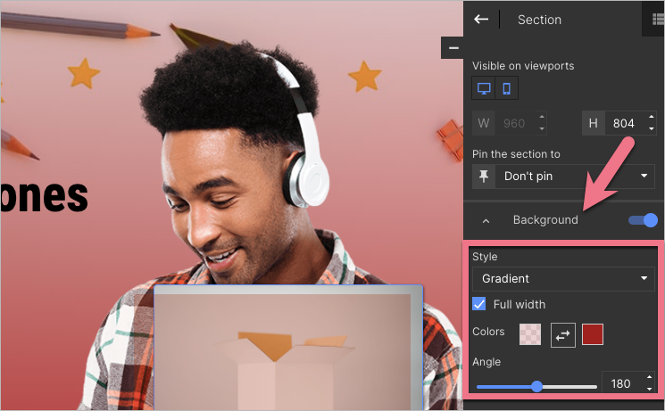 If you want to add a gradient filter to your section background image, add the image to the landing page background and then choose Gradient as a background style for the section.