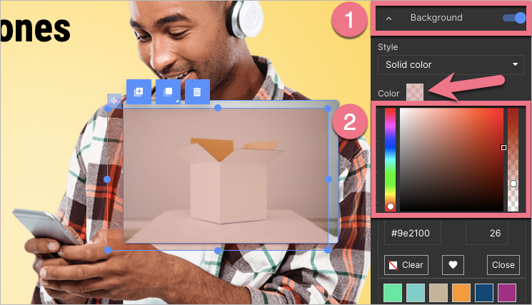 2. Adjust the size and position. Navigate to the right-side toolbar and activate the Background (1) tab. Click the Color field and then choose your color and change its transparency (2).