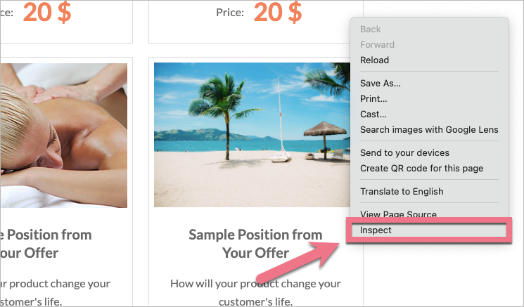 1. Go to your published landing page and right-click next to the image. Select Inspect.