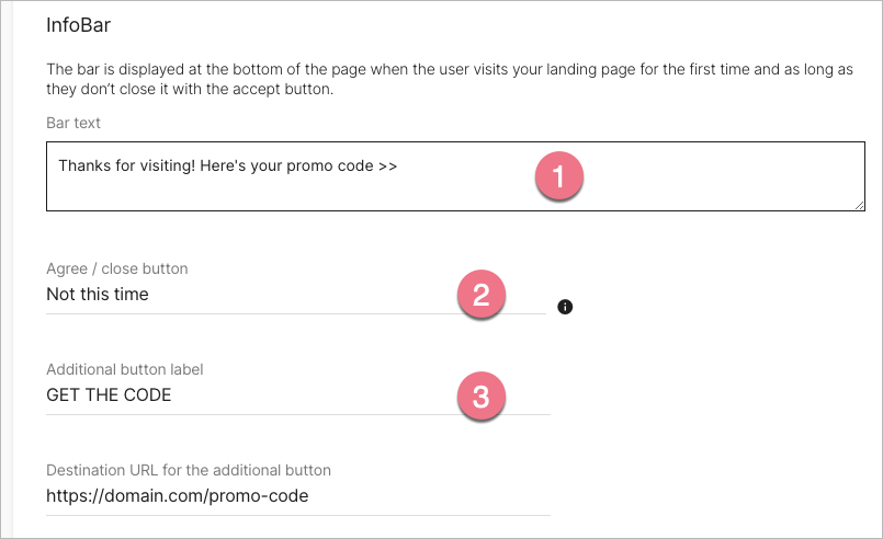 InfoBar is a thin bar that appears at the bottom of the landing page every time the user visits it the first time (and as long as they won’t close it). The bar must be defined for each landing page separately. You can use it to display information such as your privacy policy, new deals, or to promote your other services.