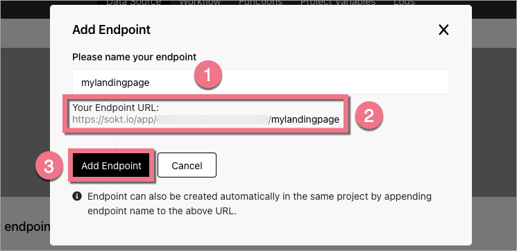 4. Name (1) the endpoint. Copy (2) its URL and click Add Endpoint (3).