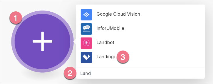 3. To create a connection between apps, click the plus icon (1), search for Landingi (2), and select it (3).