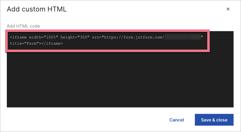 <iframe width="100%" height="300" src="YOUR_JOTFORM_LINK" title="Form"></iframe>5. Paste the code in the Add HTML code field. Change YOUR_JOTFORM_LINK to the link copied from Jotform. Adjust the width, height, and title values to your needs. Then Save & close.