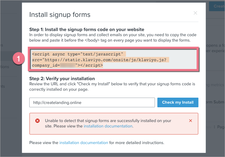 7. Go back to Klaviyo. Type your landing page URL address and click Check my Install (2). Once the integration has been installed correctly, a confirmation will appear.