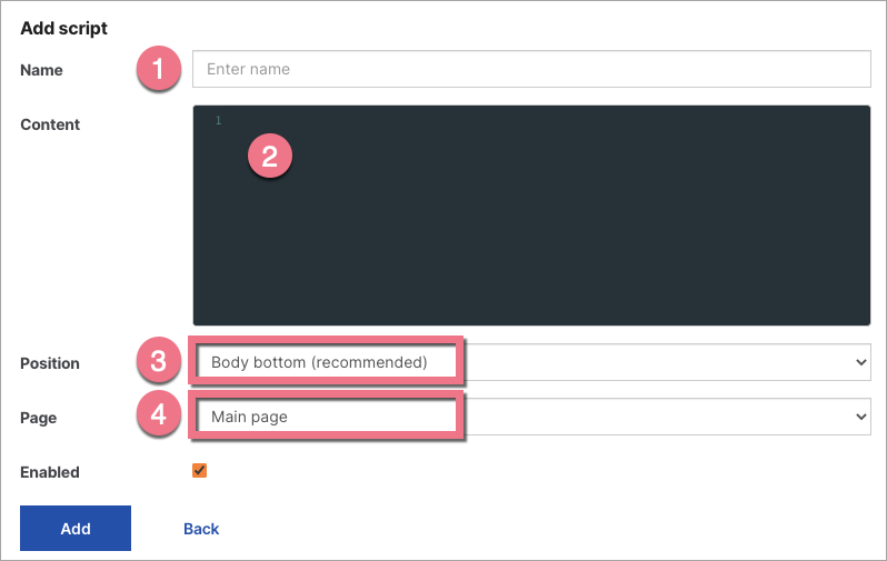 3. Name (1) your script and paste the code in the Content (2) field. Choose the Body bottom (3) position on the Main page (4). Click Add.