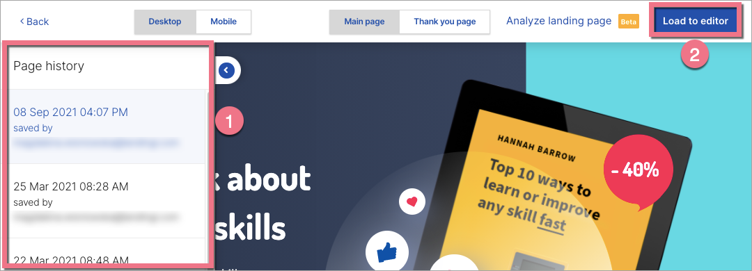 3. In the new window, you will see your landing page and the history of all changes. Click on the desired version (1), then Load to editor (2). Now you can start editing the selected version.