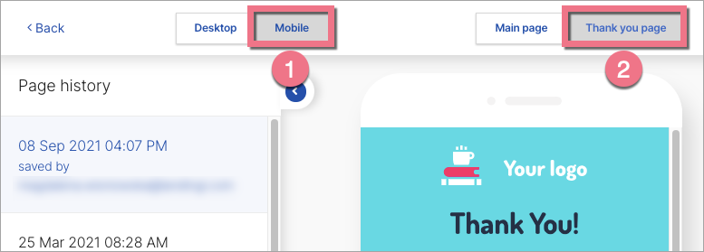 4. You can also check what the landing page version looks like in the mobile view (1) and easily go to the thank you page preview (2).
