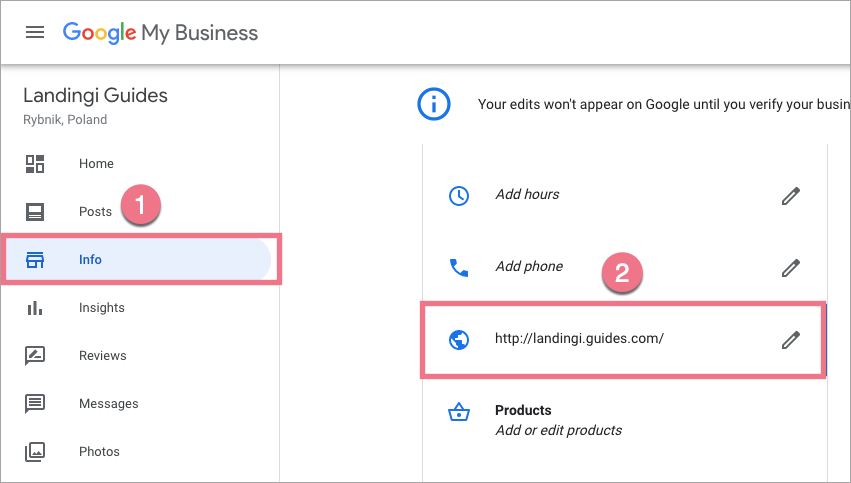 You can change the URL at any time. Log in to your Google My Business account. Go to Info (1), scroll down, and find the URL field (2), click it, and paste the new URL.
