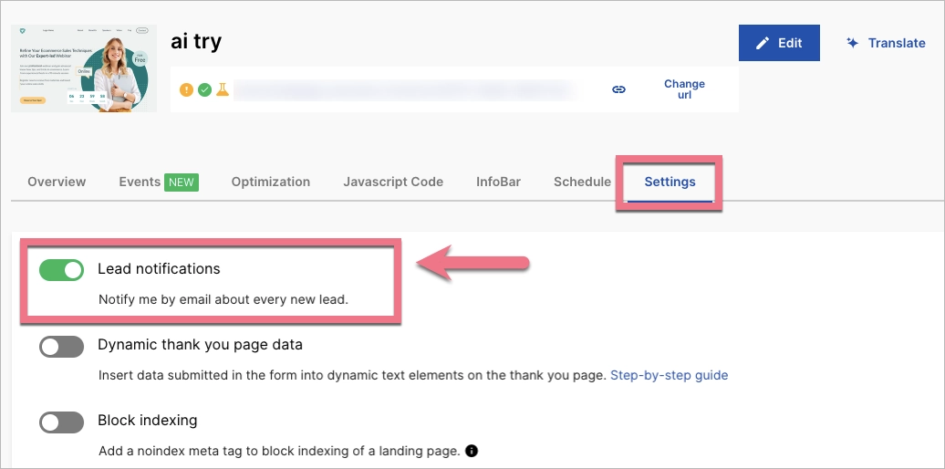 2. Enter the Settings tab and enable the Lead notifications option (Notify me by email about every new lead).