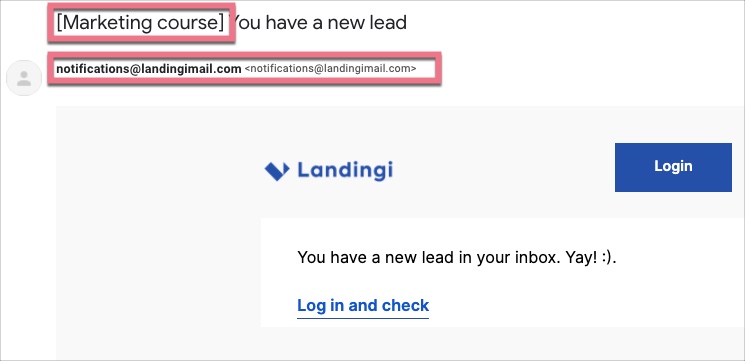 When you receive a new lead, we will send an email to the account’s owner email address from notifications@landingimail.com. The subject will include the name of your landing page.