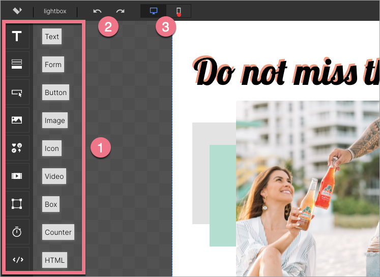 5. You can choose from 9 widgets (1) that you can put on your lightbox. Use arrows (2) if you want to undo or redo the editing. Just like the landing page, the lightbox has a desktop and mobile view (3). The mobile view is automatically created based on the desktop view, but this does not work in the other way. We recommend starting with the desktop view and then adjusting the mobile view.